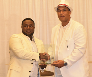 Pictured: Sam Tisdale (owner of Roots Hair and Beauty) winner of the 2017 Community Service and Leadership Excellence Award and Gary McClendon (President/CEO, People Staff, Inc.)